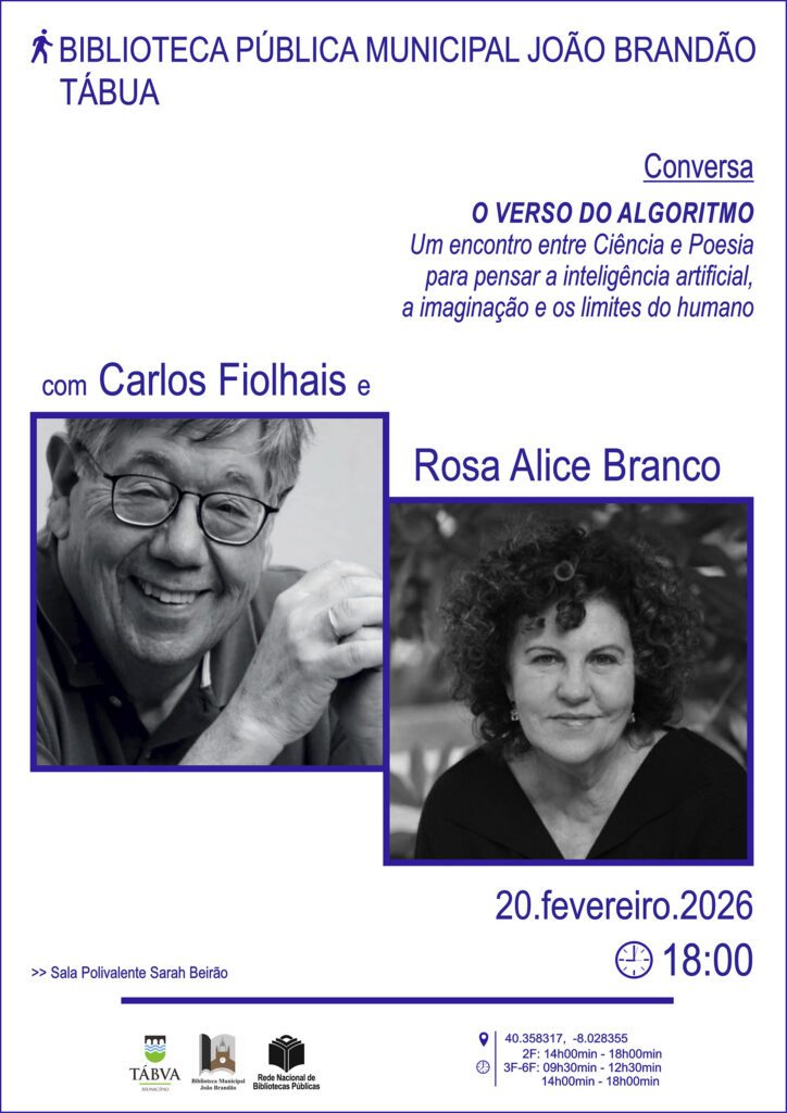 Conversa com Carlos Fiolhais e Rosa Alice Branco sobre “O verso do algoritmo – Um encontro entre ciência e poesia para pensar a inteligência artificial, a imaginação e os limites do humano”, dia 20 de fevereiro, a partir das 18h