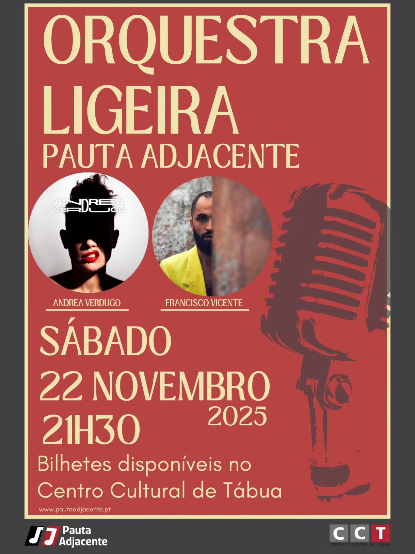 Deixe-se contagiar pelo swing da orquestra ligeira, a sofisticação do soul, o ritmo eletrizante com funk, latinos e clássicos do pop/rock! ​Com as vozes incríveis de Andrea Verdugo e Francisco Vicente. ​Marque na Agenda: ​Data: Sábado, 22 de Novembro de 2025Hora: 21h30Local: Centro Cultural de TábuaBilhetes: Disponíveis no Centro Cultural de Tábua. Não perca!